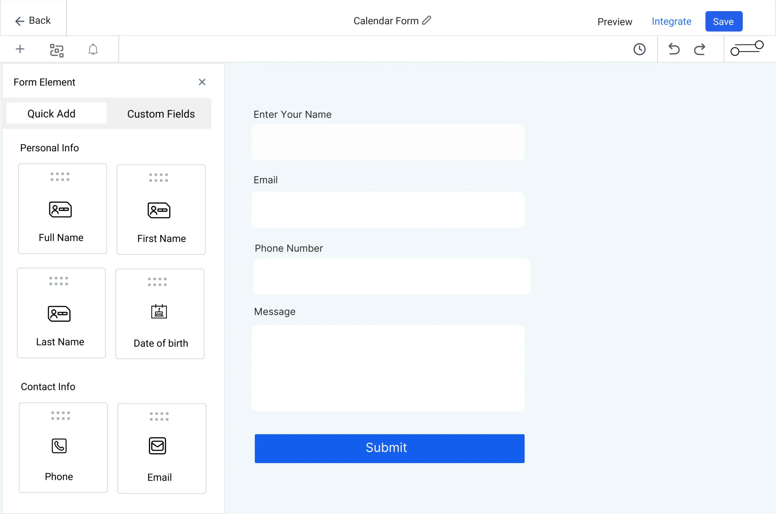 Adding an element to your web form is as easy as dragging and dropping. Available elements are shown on the right. Simply drag them to the left to add them to your form. Elements range from input boxes to radio buttons, and more. Go play!