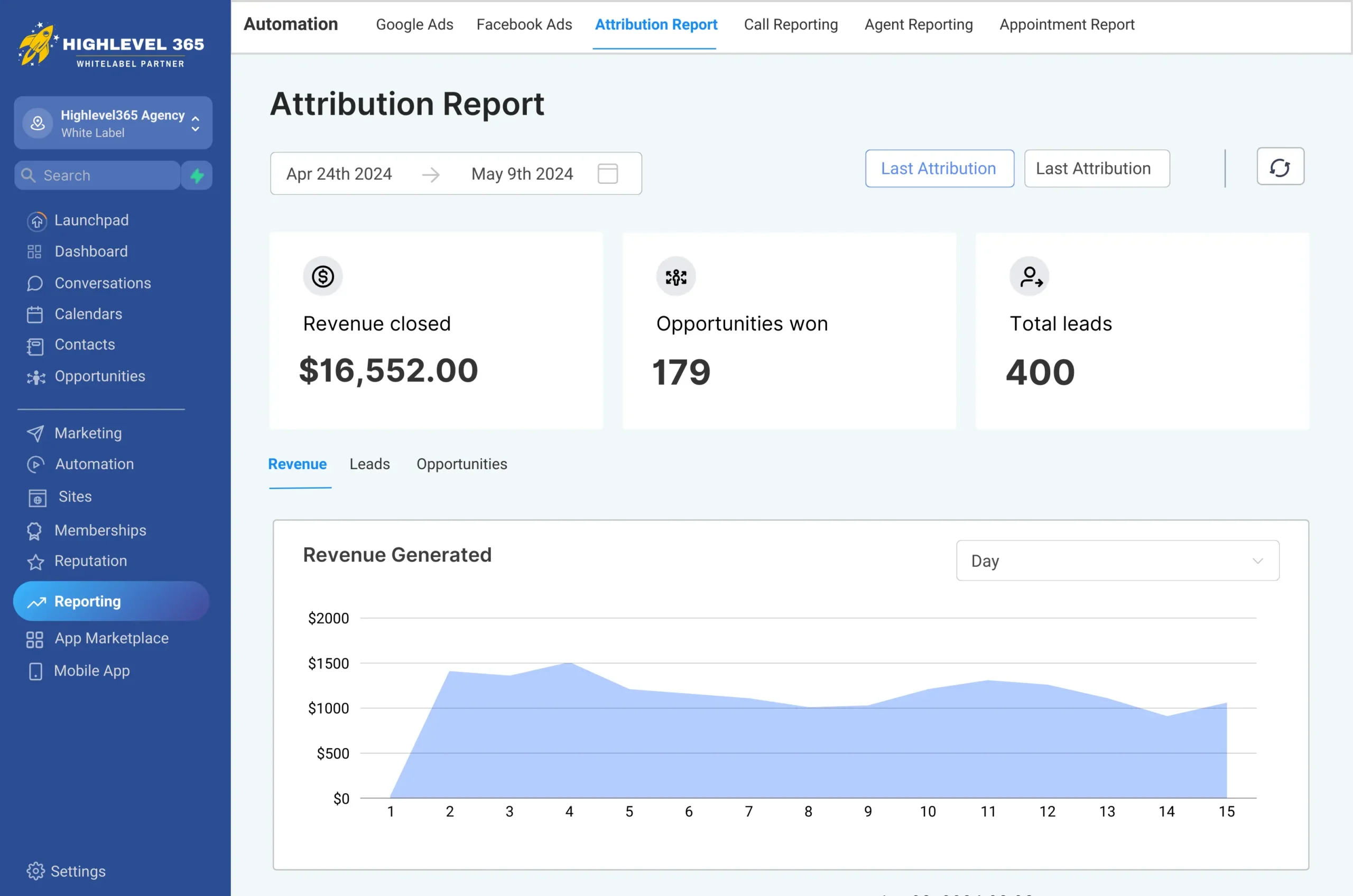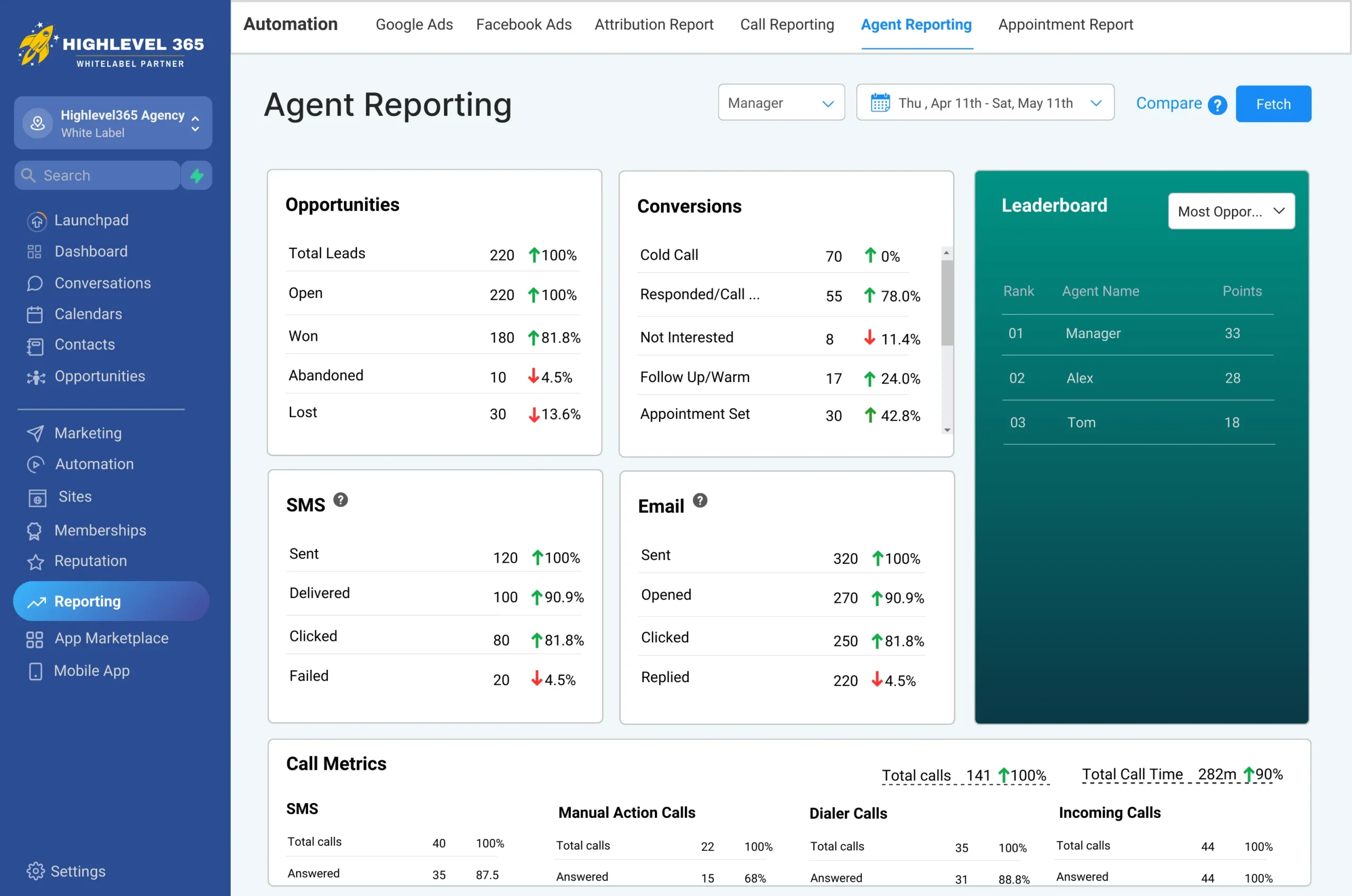 Highlevel365 provides analytics that help you understand your sales team’s performance at a glance. Easily track metrics like call reports, agent performance, and appointment scheduling to enhance team efficiency.