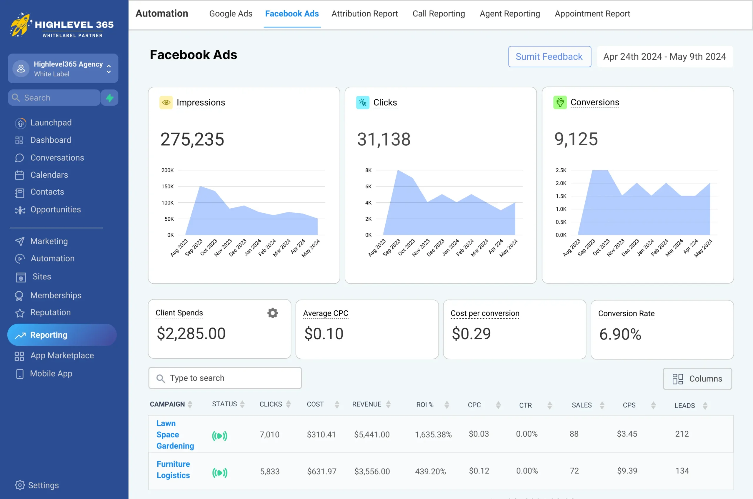 Yes, Highlevel365offers integration with Facebook and Google ads, providing a comprehensive dashboard to monitor ad campaigns’ metrics such as impressions, clicks, conversions, CPC, and more in one centralized location.